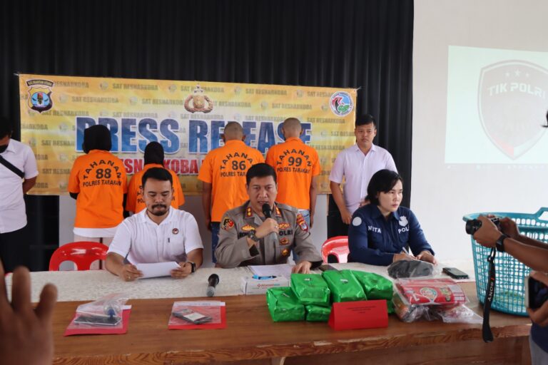 “Rangkaian kejadiannya panjang. Rilis hari ini juga untuk meningkatkan kewaspadaan bersama memohon bantuan masyarakat untuk mendukung P4G khususnya pemberantasan narkoba menjadi domain kami,” ungkap Kapolres Tarakan AKBP Ronaldo Maradona, T.P.P Siregar didampingi Kasat Resnarkoba Polres Tarakan, IPTU Gian Evla Tama dan KBO serta Kasi Humas Polres Tarakan.